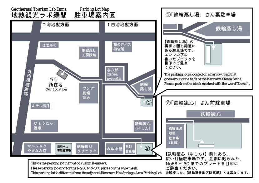 電車/バスの場合:別府駅西口3番乗り場より、亀の井バス 2[竹ノ内経由鉄輪線]、5[野口原経由APU線]、7[野口原経由別府リハビリ線]のいずれかに乗車し、「鉄輪」下車、徒歩5分